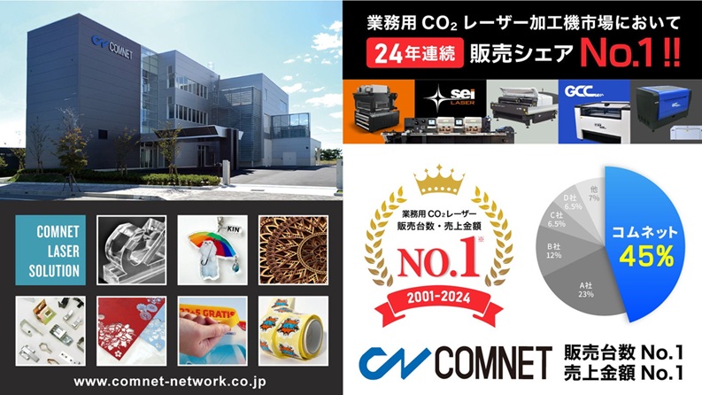 レーザ加工機メーカーSEI社の「SEIシリーズ」、GCC社の「LaserProシリーズ」を発売以来、おかげさまで販売台数6,000台を突破いたしました。業務用CO2レーザを取り扱っている販売会社は当社以外に国内に12社(メーカーは5社)ありますが、当社の販売実績数は、業界トータル販売数の約45%のシェアを獲得し、年間販売台数・売上金額も調査を始めた2001年~現在に至るまでの間、業界内で24年連続で堂々の第1位の実績を誇ります。